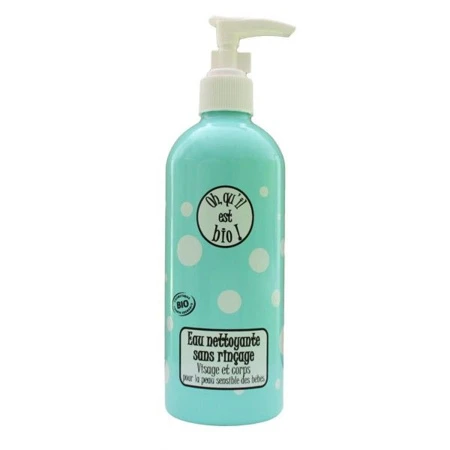 L’eau nettoyante « Oh Qu’il est Bio! » est sans rinçage et laisse la peau de bébé parfaitement propre et fraîche. Cette eau nettoyante est formulée à base d’eau florale de rose. 330 ml
