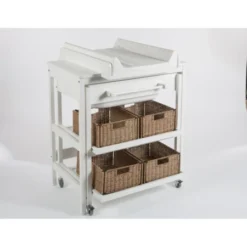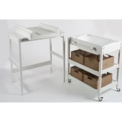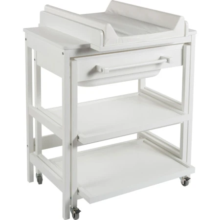 Meuble de bain Smart – QuaxCe meuble de bain contient une table à langer et une baignoire.Baignoire en pvc.Matelas à langer.Etagères pleines extractibles sur glissières, roulettes en pvc.Convertible en commode. Dimensions position fermée et sans plan à langer : 82 x 47 x 90H cmDimensions de la baignoire : 74 x 44 x 78H cmDimensions de la table à langer : 72 x 53 x 8H cmPoids : 28 kilos