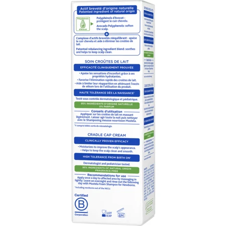 Appliquer sur les croûtes de lait en massant légèrement. Laisser agir toute la nuit puis nettoyer avec le Shampooing mousse nourrisson Mustela.