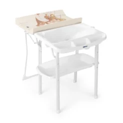 Table à langer souple avec système anti-basculement et extractible pour permettre à la maman de donner son bain au bébé et de pouvoir le changer facilement, baignoire avec 2 assises anatomiques (une inclinée pour bébés de 0 à 6 mois et une assise pour bébés de 6 à 12 mois), espaces porte-objets et porte-éponge, bouchon et tuyau pour vidange de l’eau, tiroir porte-objets.