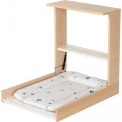 Elle propose un plan à langer spacieux de 75 x 55 cm. Une étagère de rangement est présente au-dessus du plan à langer.