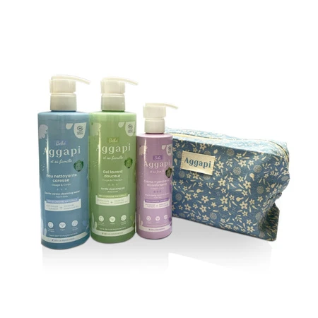 Elle se compose de trois produits, proposés dans une trousse en coton bio certifié GOTS (Global Organic Textile Standard) pour une fabrication respectueuse de l’environnement et de l’être humain. Avec 99% d’ingrédients naturels et une certification bio et vegan, ces produits ont été testés dermatologiquement. Vous trouverez dans cette trousse Aggapi : un gel lavant douceur de 390 mL, une eau nettoyante caresse de 390 mL et une crème hydratante réconfortante de 200 mL.